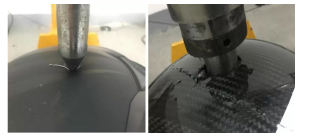 mainly reflects the helmet's ability to prevent damage to the head when it encounters sharp objects. In the test, a steel cone with a mass of 3 kg, a diameter of 25 mm, and a cone angle of 60° is used. The steel cone is dropped from a specified height (3 m for type A helmets) to carry out a penetration test on the helmet. After the test, the steel cone must not penetrate the helmet and come into contact with the head shape, and the helmet shell must not have cracks. The test results are shown in Figures 5 and 6.