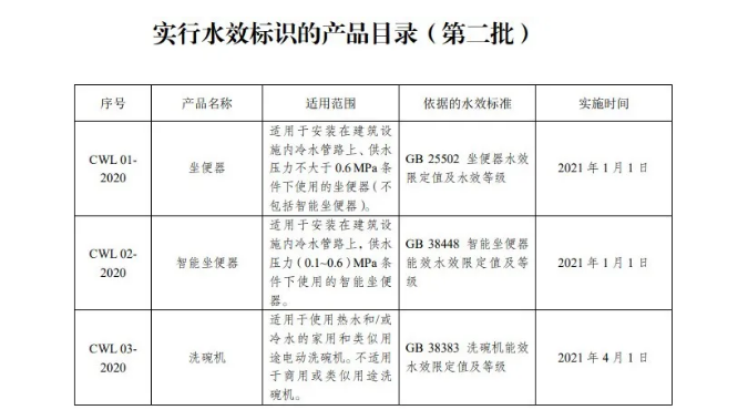 In accordance with the "Measures for the Administration of Water Efficiency Labeling", the National Development and Reform Commission, the Ministry of Water Resources, and the State Administration for Market Supervision have organized and revised the "Product Catalogue of the People's Republic of China Implementing Water Efficiency Labeling (Second Batch)" and "Smart Toilet Water Efficiency Labeling "Implementation Rules" "Implementation Rules for Dishwasher Water Efficiency Labeling", "Implementation Rules for Dishwasher Water Efficiency Labeling" will be implemented from April 1, 2021. Products that are shipped or imported before April 1, 2021 can be postponed to 2022 The water efficiency mark shall be added before April 1.