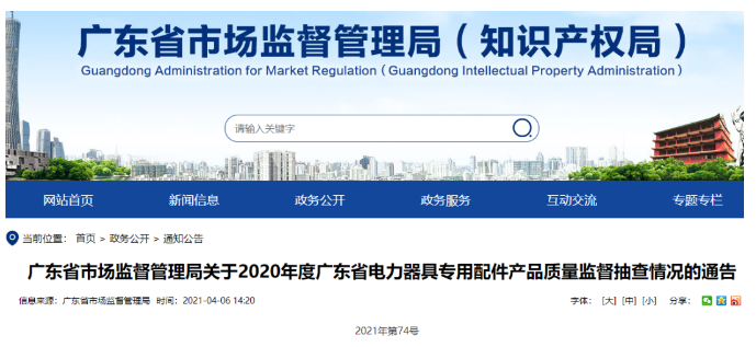 Announcement of the Guangdong Provincial Administration of Market Supervision on the Spot Check of the Quality Supervision of Special Accessories for Power Appliances in Guangdong Province in 2020