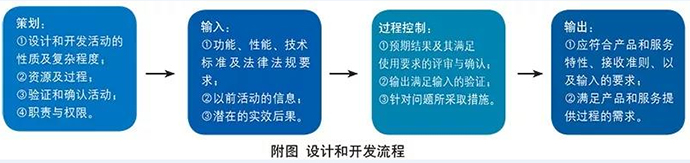 组织应建立、实施和保持设计和开发的策划、输入、过程控制、输出以及更改的过程,确保后续的产品和服务的提供。在设计和开发的各个控制阶段,主要考虑设计和开发活动的性质、产品和服务的具体类型、输出满足输入的要求、提供产品和服务过程的需求,设计和开发流程见附图。