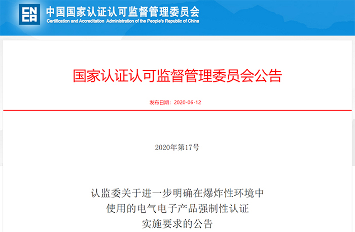 认监委关于进一步明确在爆炸性环境中使用的电气电子产品强制性认证