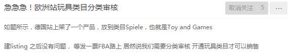 卖家b: 在德国站上架了一个玩具类目的产品,同样也收到了需要审核的提示:you need approval to sell on this category Toy and Games(你必须获得批准才能在玩具和游戏类目销售)。