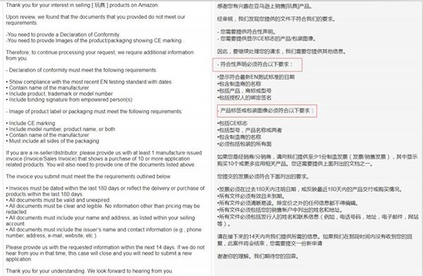 从邮件的内容中看出,亚马逊认为卖家提供的文件不符合平台的要求。并让卖家接下来的14天内向平台提供符合性声明和显示CE标志的产品/包装图像。