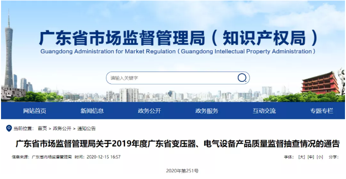 广东省市场监督管理局关于2019年度广东省变压器、电气设备产品质量监督抽查情况的通告