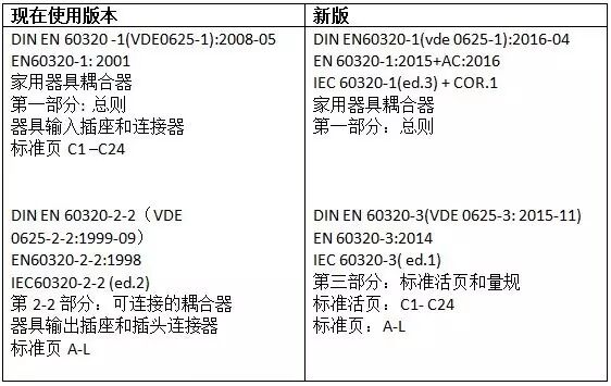从2016年4月起,VDE发出了正式通知:针对器具耦合器产品有标准更新。大致内容:DIN EN 60320标准出现了整合。针对DIN EN 60320-1(总则;器具输入插座和连接器;)有最新的标准版本。之前的标准DIN EN 60320-2-2(输出插座和插头连接器)将被取消,被DIN EN 60320-3所取代,所有的器具耦合器的标准尺寸页等信息将在此新标准内体现。重要的是:部分的测试要求有所改变。