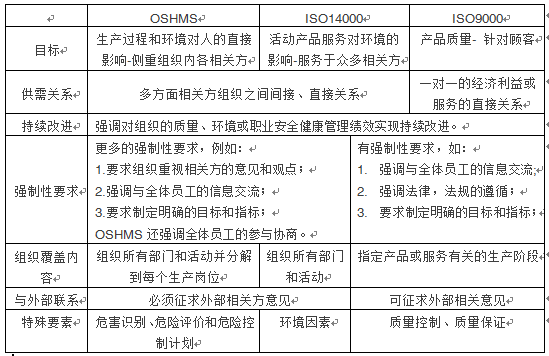 ISO9001、ISO14001及OHSAS18001均是组织全面管理的重要组成部分,它们分别从不同的侧面规范组织的活动和行为,具体如下: